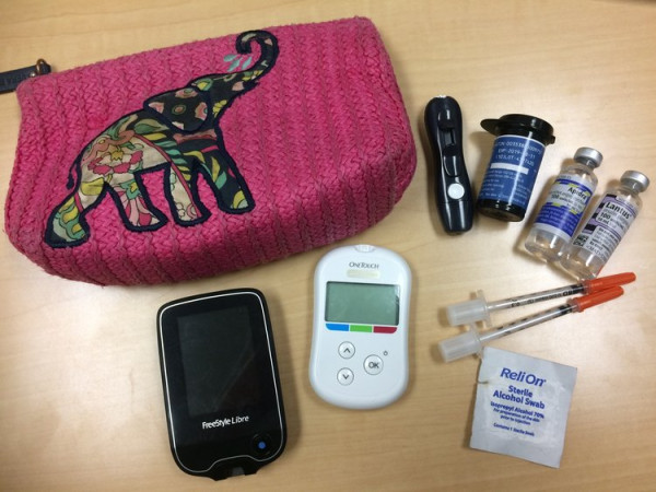 Je transporte toutes mes fournitures pour le diabète dans une pochette à fermeture éclair brodée d'un éléphant rose à motifs cachemire. Avant, j'avais une pochette à fermeture éclair décorée d'oiseaux et de baies. Je range toujours mes fournitures dans un contenant joyeux, qui n'a rien de sérieux ni de technique, afin que chaque geste d'autosoins que je fais me semble moins médicalisé.