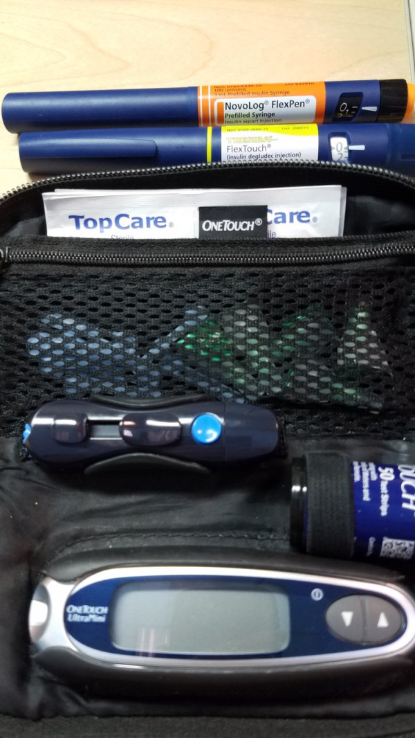 Je transporte beaucoup de fournitures, comme des bandelettes réactives, des tampons alcoolisés et des aiguilles pour stylos, et je m'assure de toujours les avoir avec moi. Parfois, je prépare des trousses supplémentaires pour des occasions particulières, comme des voyages en voiture ou des courses plus longues.