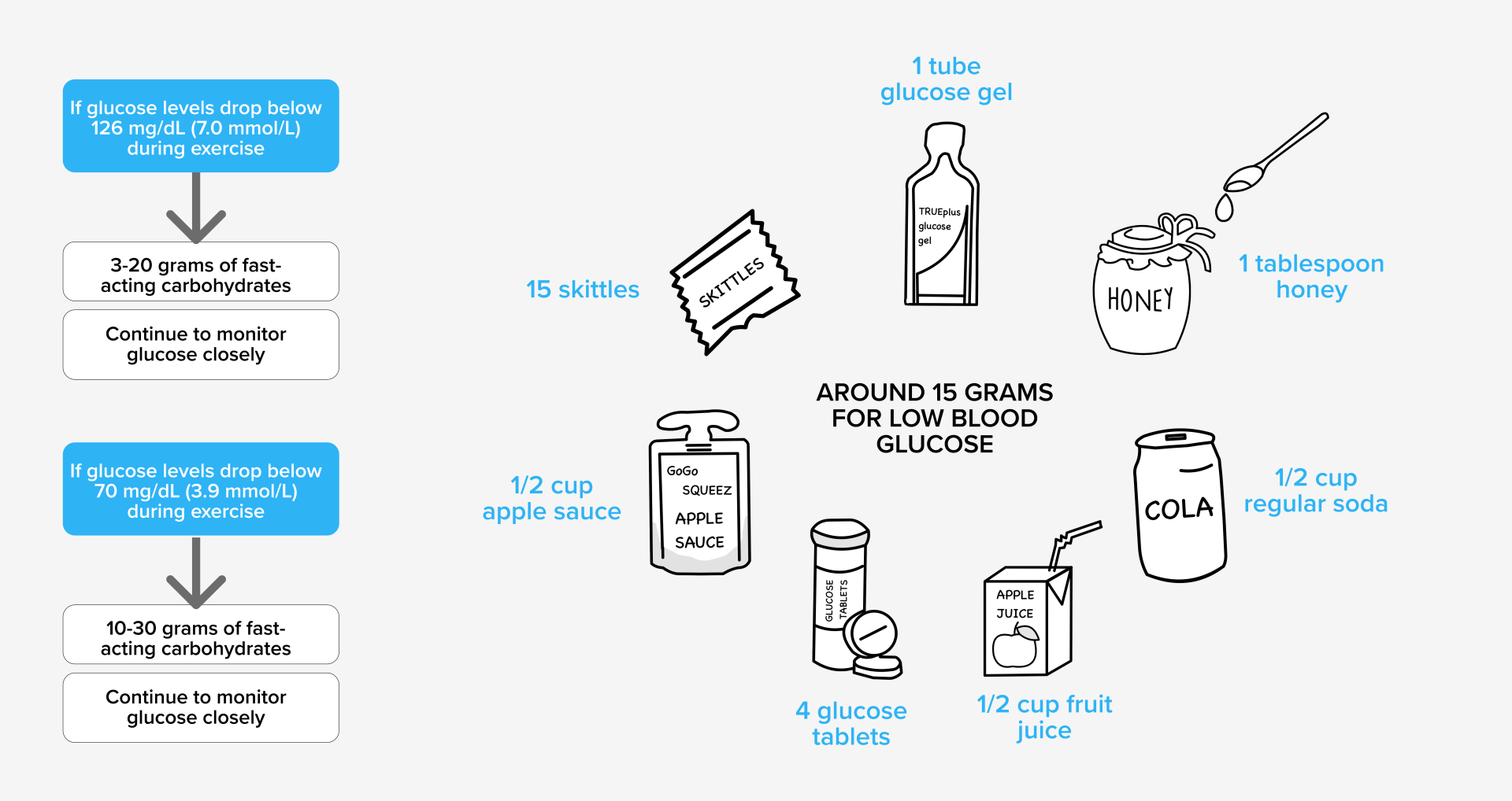 Se durante l'esercizio fisico i livelli di glucosio scendono al di sotto di 126 mg/dL (7,0 mmol/L), di solito è consigliabile assumere carboidrati a rapido assorbimento (circa 3-20 grammi) per evitare che scendano troppo. Continua a controllare attentamente il glucosio e assumi più carboidrati ogni 20-30 minuti, secondo necessità. Moser O, Riddell MC, Eckstein ML, et al. Gestione del glucosio durante l'esercizio fisico utilizzando sistemi di monitoraggio continuo del glucosio (CGM) e CGM a scansione intermittente (isCGM) nel diabete di tipo 1: dichiarazione ufficiale dell'Associazione Europea per lo Studio del Diabete (EASD) e della Società Internazionale per il Diabete Pediatrico e Adolescenziale (ISPAD), approvata dalla JDRF e sostenuta dall'Associazione Americana per il Diabete (ADA). Diabetologia.|https://pubmed.ncbi.nlm.nih.gov/33047169///
