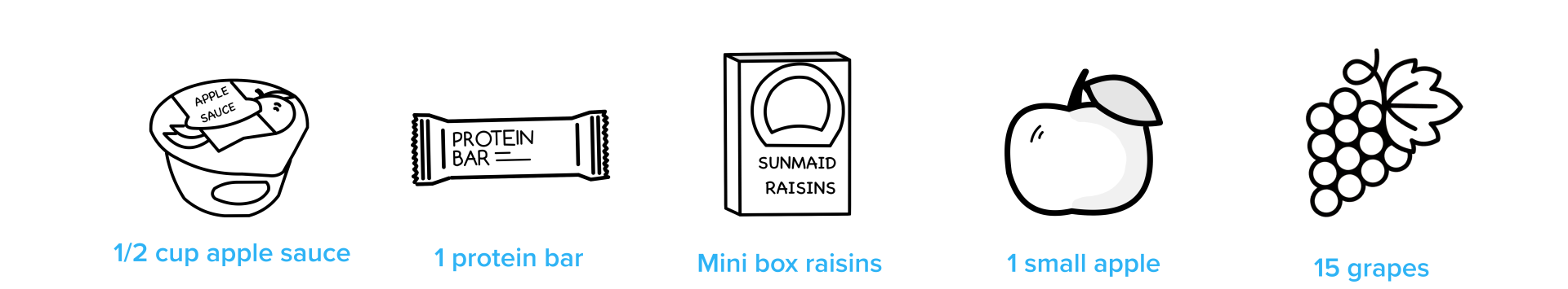 Esempi di snack con circa 15 grammi di carboidrati ad azione rapida: Trattamento dell'ipoglicemia. ucsfhealth.org. Accesso effettuato il 10 luglio 2024. https://www.ucsfhealth.org/education/treating-low-blood-sugar|https://www.ucsfhealth.org/education/treating-low-blood-sugar/